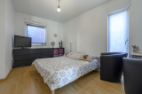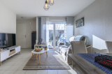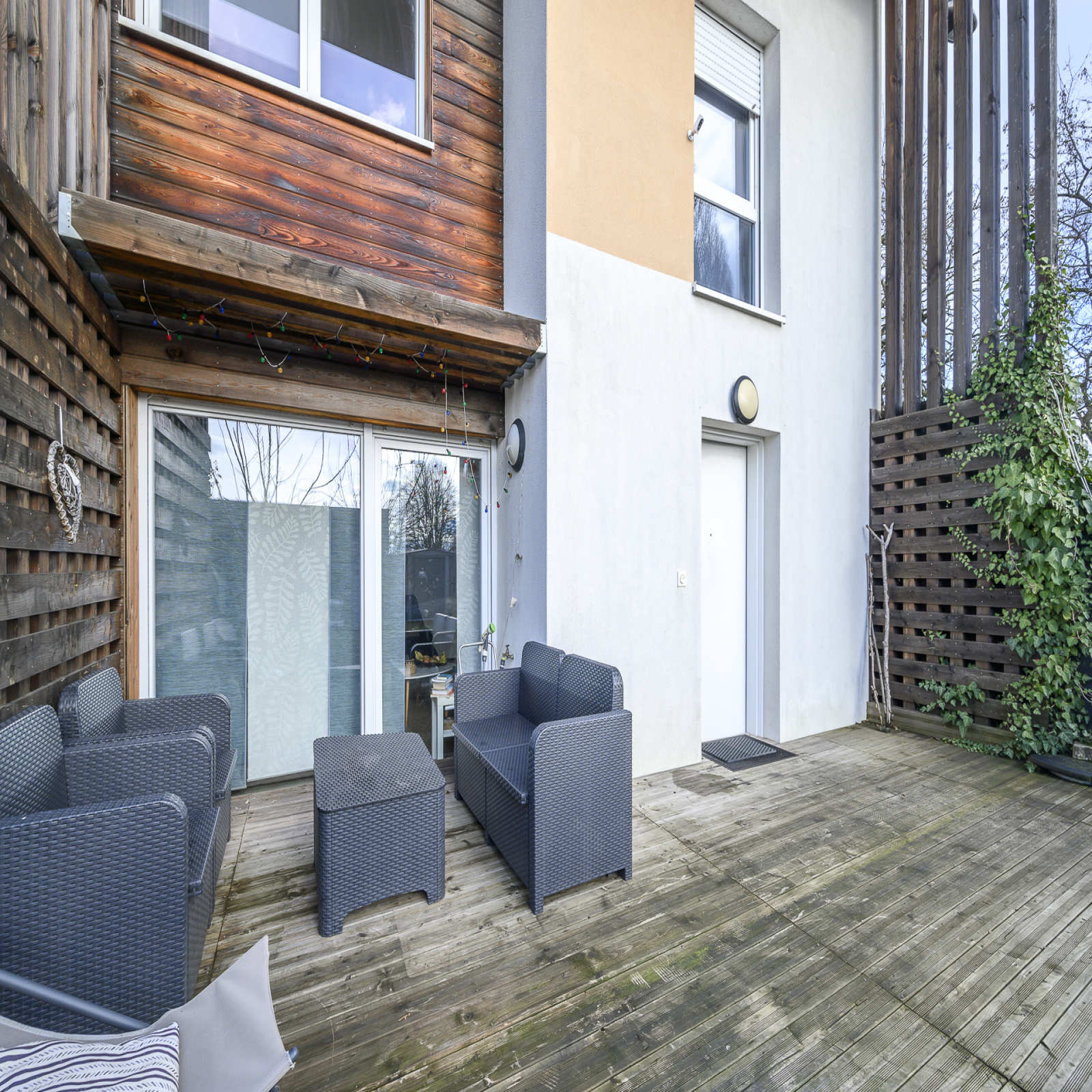 Elle se compose en partie basse d'une entrée avec placards, d'une salle d'eau avec WC, d'un espace de vie donnant sur une terrasse de 10m² avec un jardin de 90m², d'une cuisine ouverte sur le séjour donnant accès à une autre terrasse de 6m² avec son jardin de 25m² et d'une chambre de 11m².